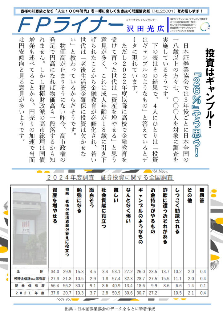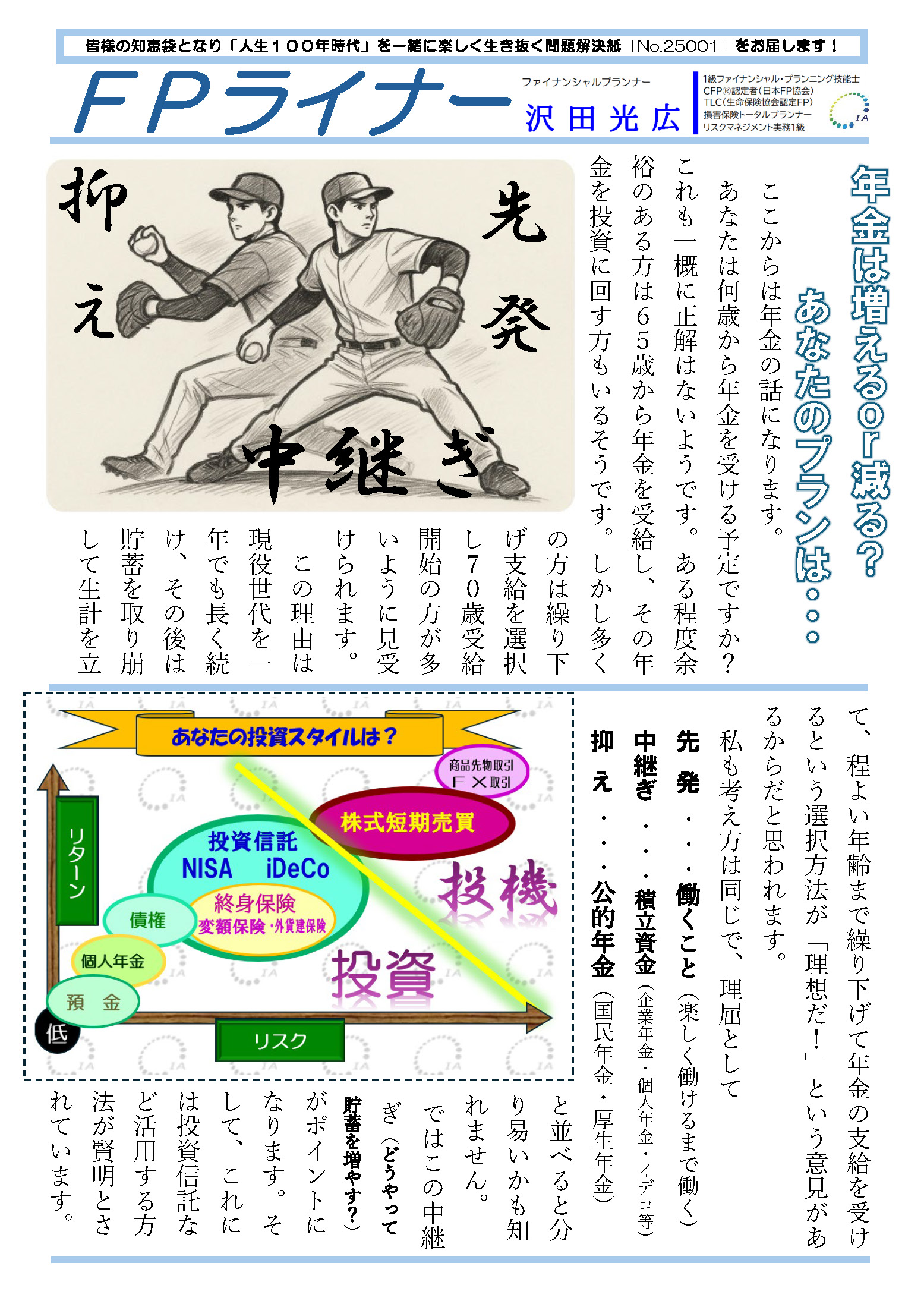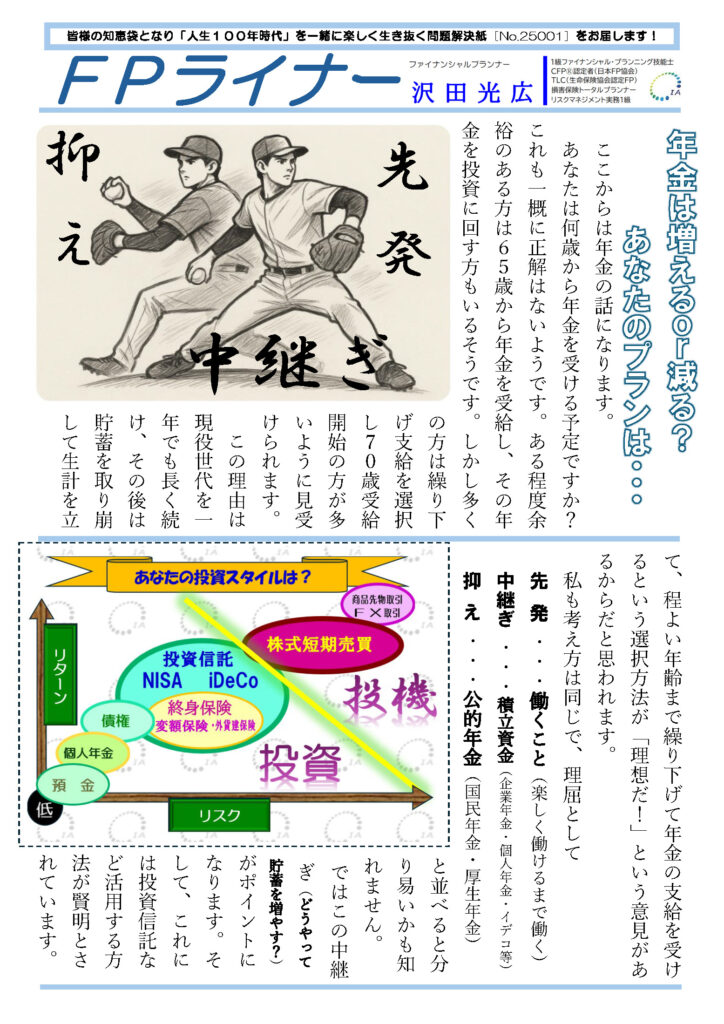 お客様サービス 「FPライナー」発行のおしらせ 2025年10月27日 2025年10月27日 cosmo-renewal-administrator PDFで表示 この秋にFPライナーなるものを創刊しました。 第1回は年金に関わる内容で、老後生活資金の考え方についてです。 もし内容をごらんになり「もっと話が聞きたい・・・」と思われた場合はお電話いただければと思います。 【コスモほけんサービス 二戸店】TEL:0195-43-3733