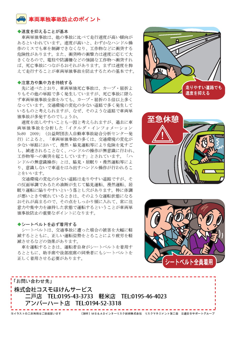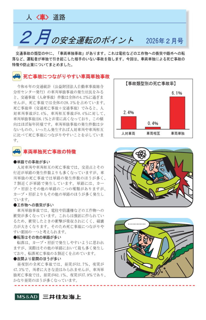 お客様サービス 2月の「安全運転のポイント」を掲載 2026年1月28日 2026年1月28日 cosmo-renewal-administrator 毎月更新しております「安全運転のポイント」の2月号を掲載しました。 PDFはこちら 安全運転のポイント2月号は「車両単独による死亡事故の特徴や防止策について」について掲載しました。 ご契約の皆さまどうぞご活用ください