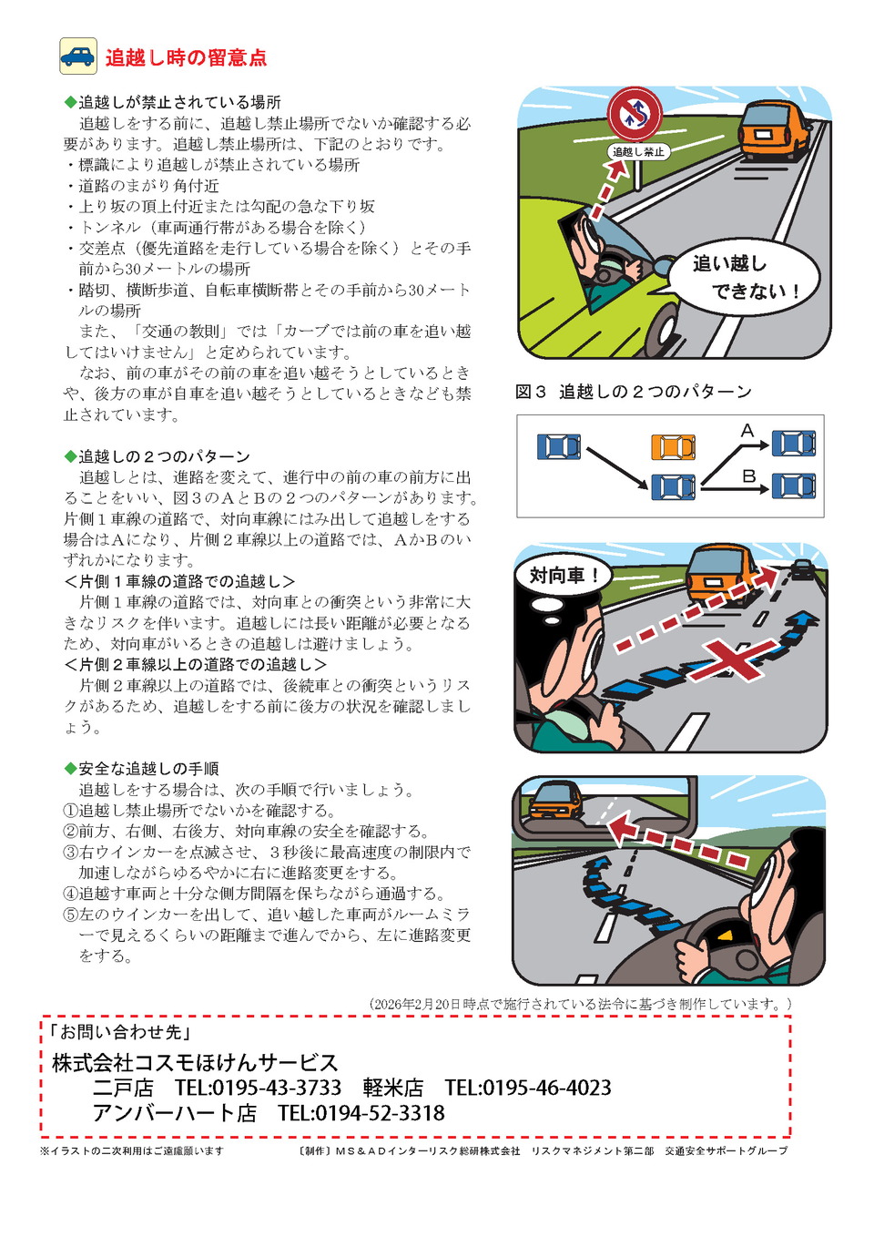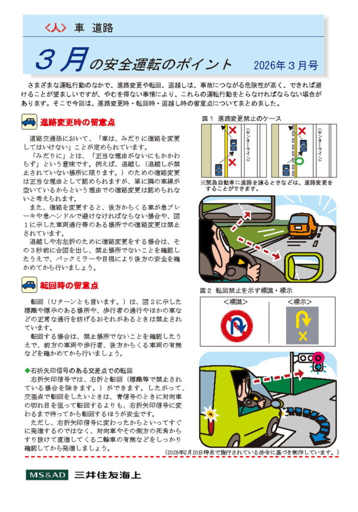お客様サービス 3月の「安全運転のポイント」を掲載 2026年2月27日 2026年2月27日 cosmo-renewal-administrator 毎月更新しております「安全運転のポイント」の3月号を掲載しました。 PDFはこちら 安全運転のポイント3月号は「進路変更時・転回時・追越し時の留意点」について掲載しました。 ご契約の皆さまどうぞご活用ください